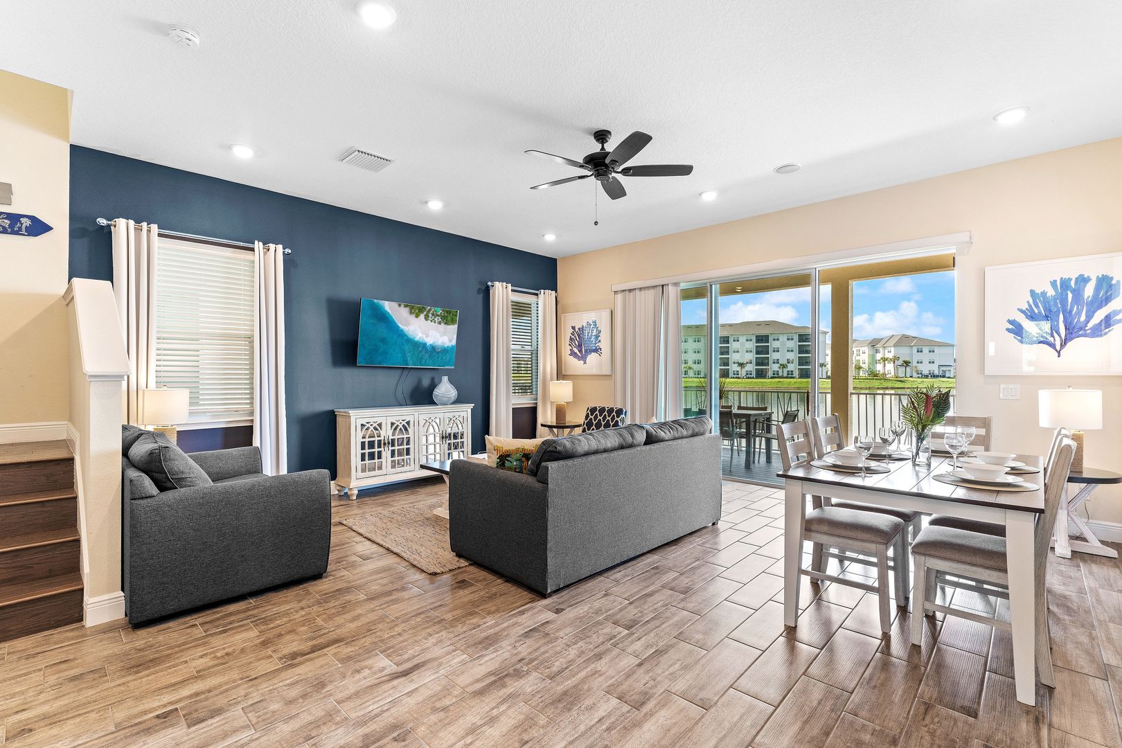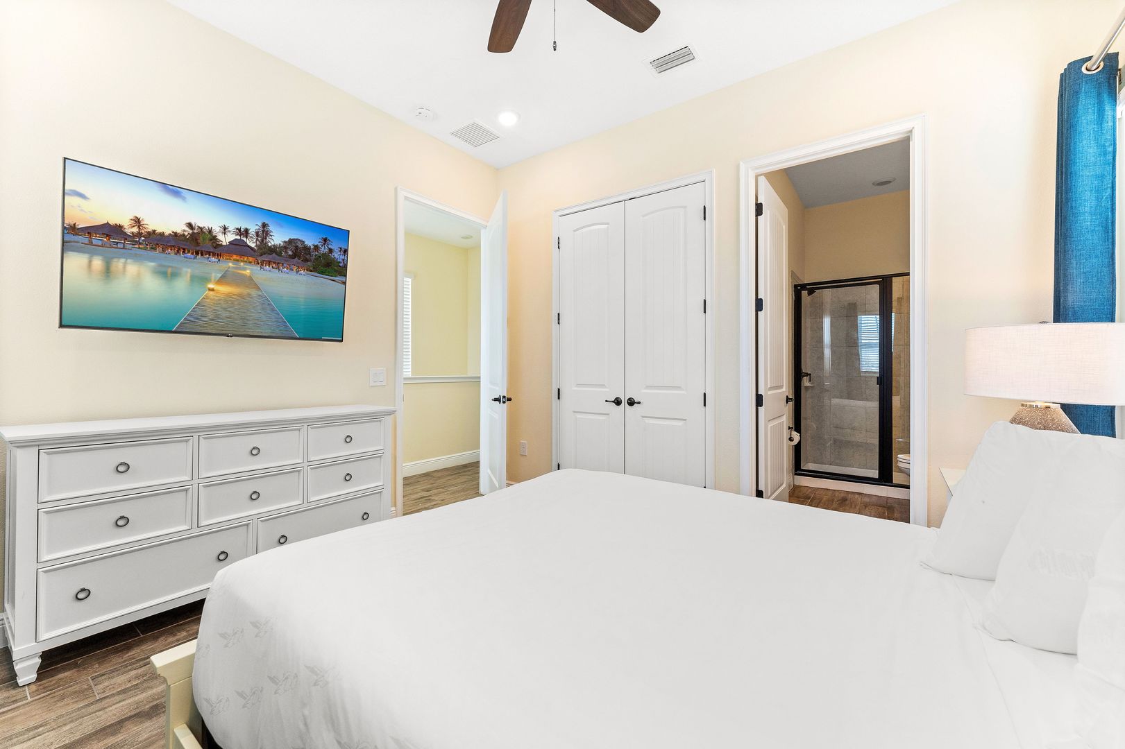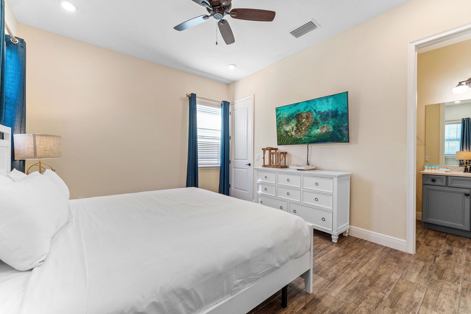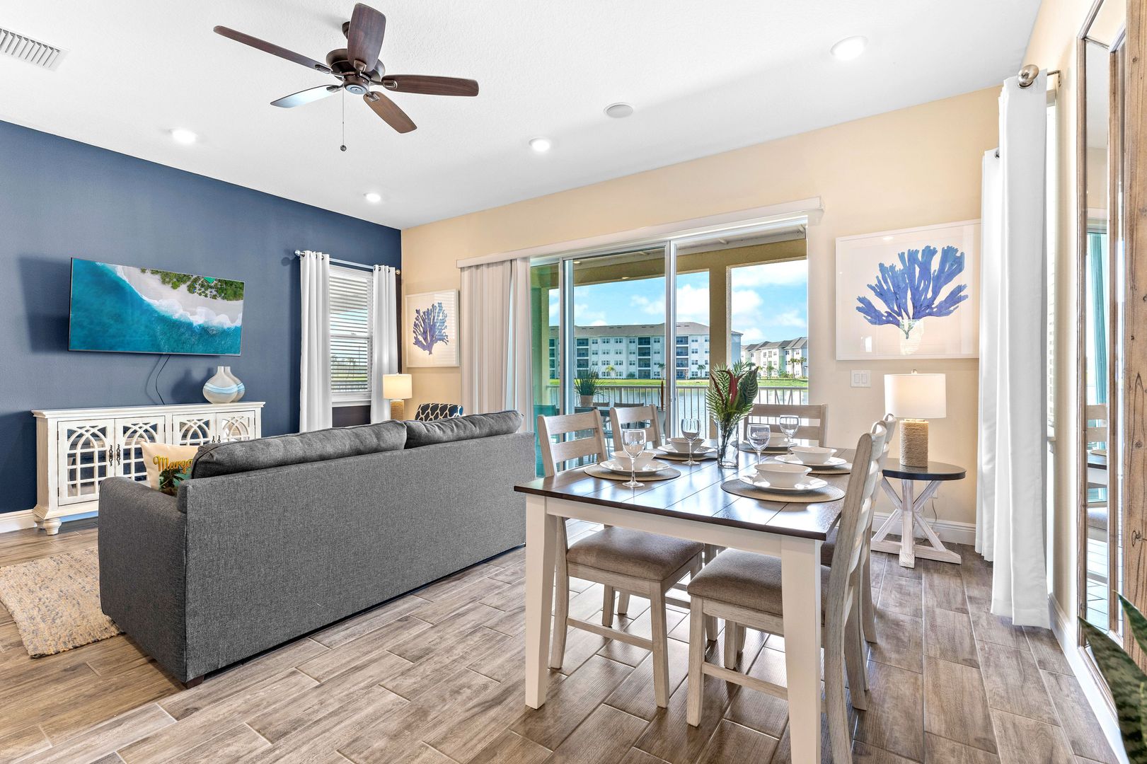 Welcome to Laffite’s Landing, a beautifully furnished waterfront cottage in the heart of Margaritaville Resort Orlando. This 3-bedroom, 3-bath home comes with the official Margaritaville furniture package. The two-story layout is both comfortable and functional. The main floor features one bedroom and a full bath, ideal for guests, while upstairs offers two additional bedrooms, each with its own private bathroom.