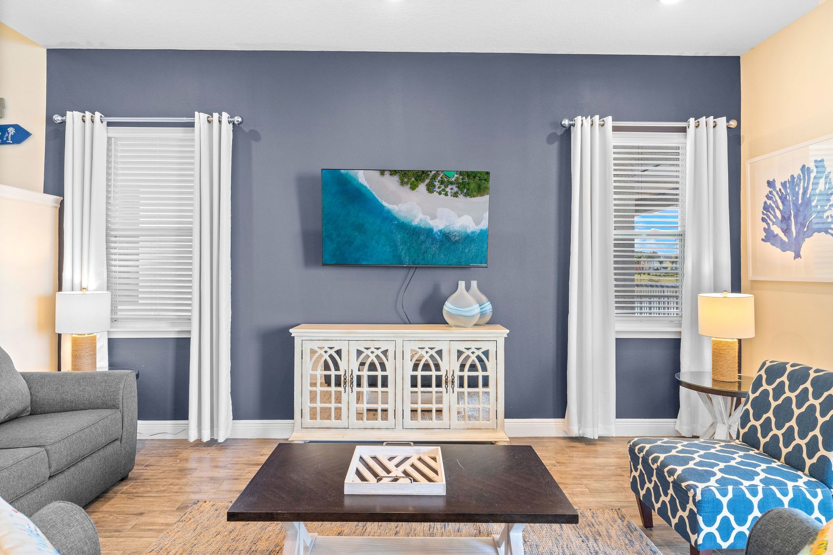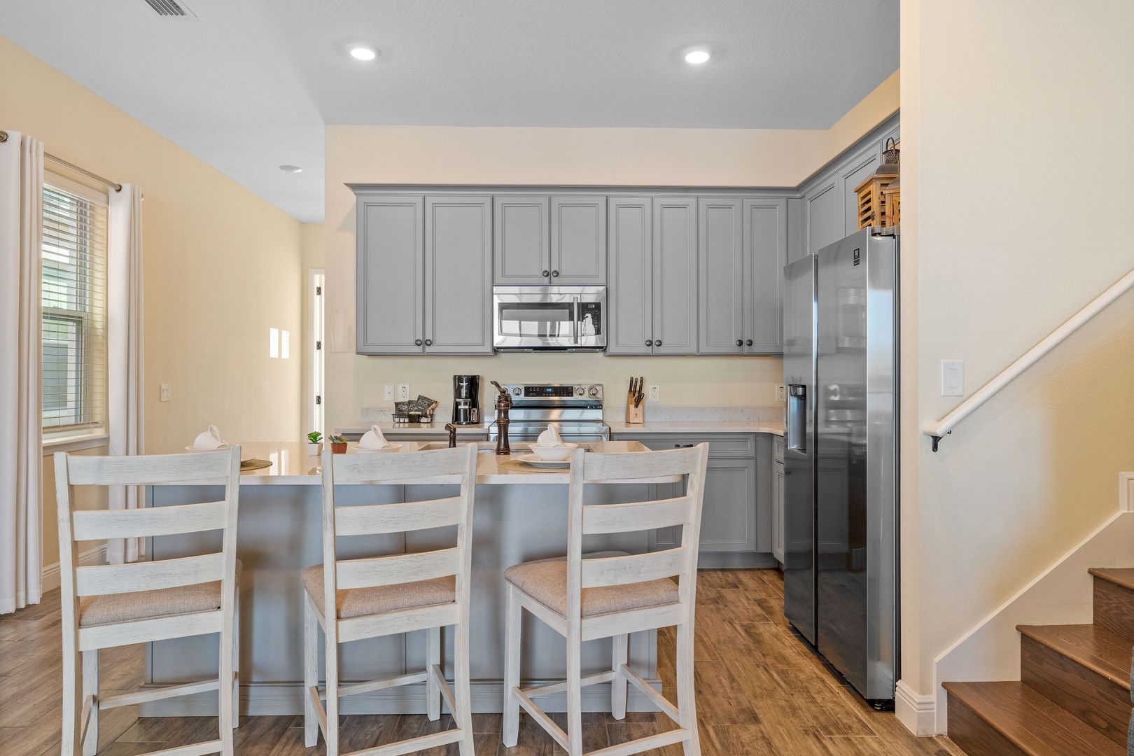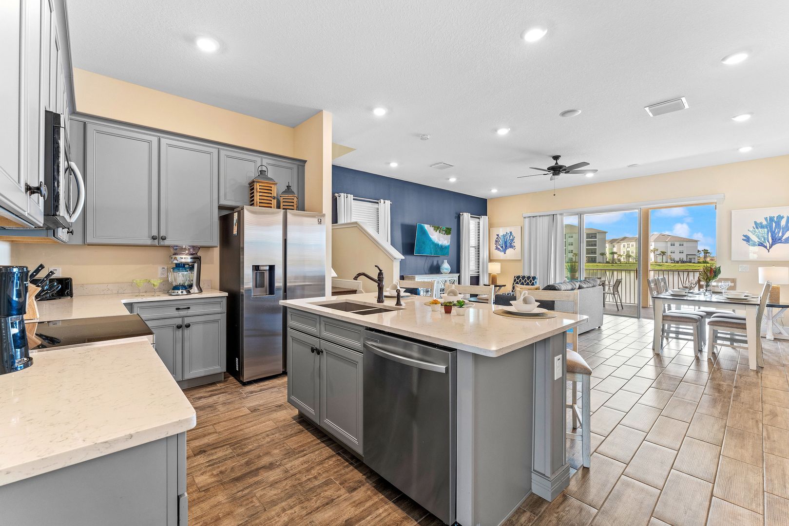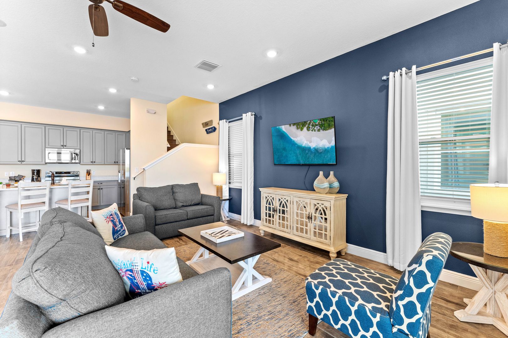 Welcome to Laffite’s Landing, a beautifully furnished waterfront cottage in the heart of Margaritaville Resort Orlando. This 3-bedroom, 3-bath home comes with the official Margaritaville furniture package. The two-story layout is both comfortable and functional. The main floor features one bedroom and a full bath, ideal for guests, while upstairs offers two additional bedrooms, each with its own private bathroom.