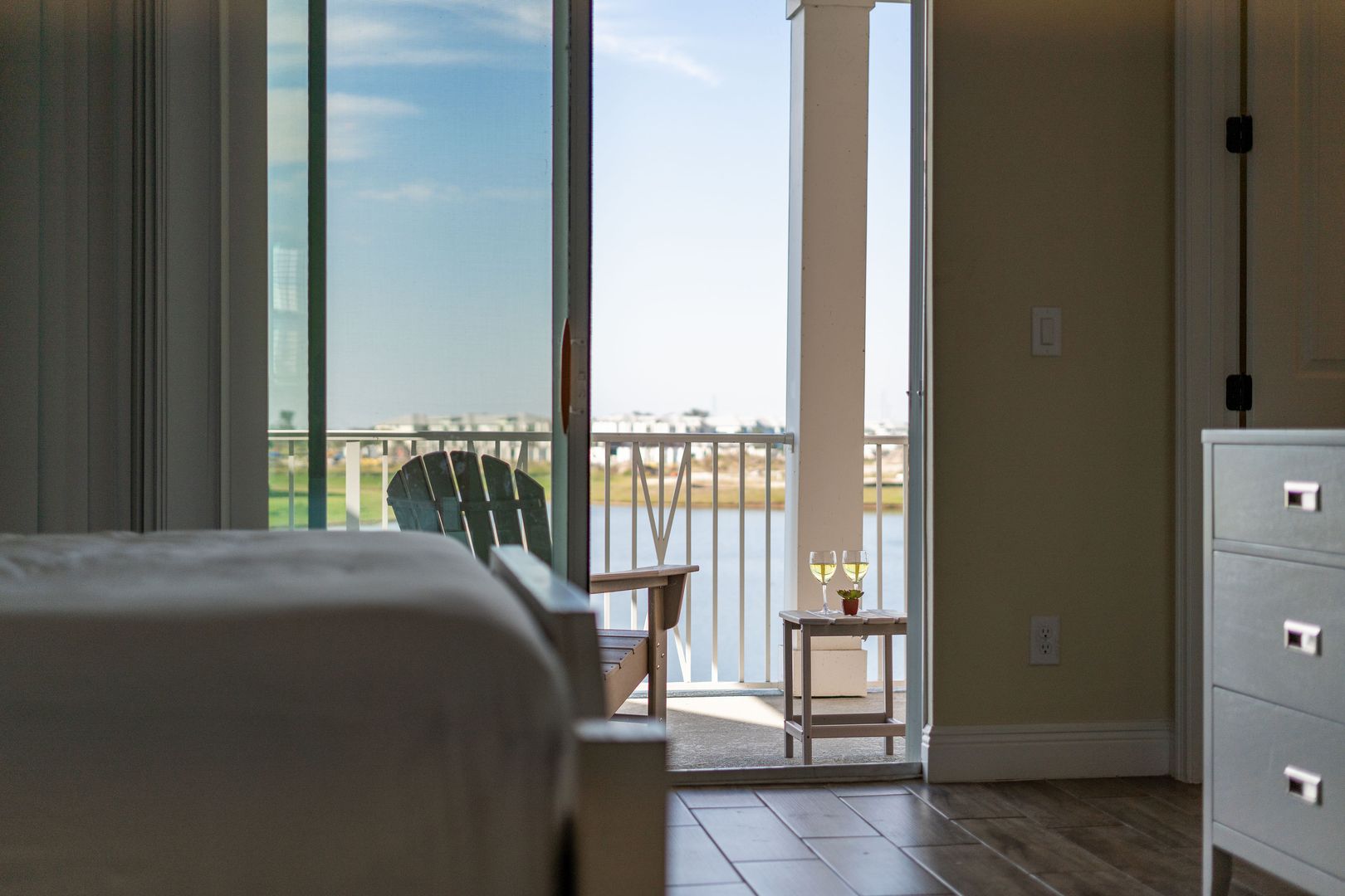 Inside, the open living area features tile flooring, a bright and airy feel, and a seamless flow between the kitchen, dining, and living spaces. The kitchen includes quartz countertops, stainless steel appliances, and plenty of cabinet space. Sliding glass doors lead to the first-floor balcony, blending indoor and outdoor living. The upstairs primary suite includes a private balcony with stunning water views. The home also features a durable metal roof and a low-maintenance exterior for easy ownership.