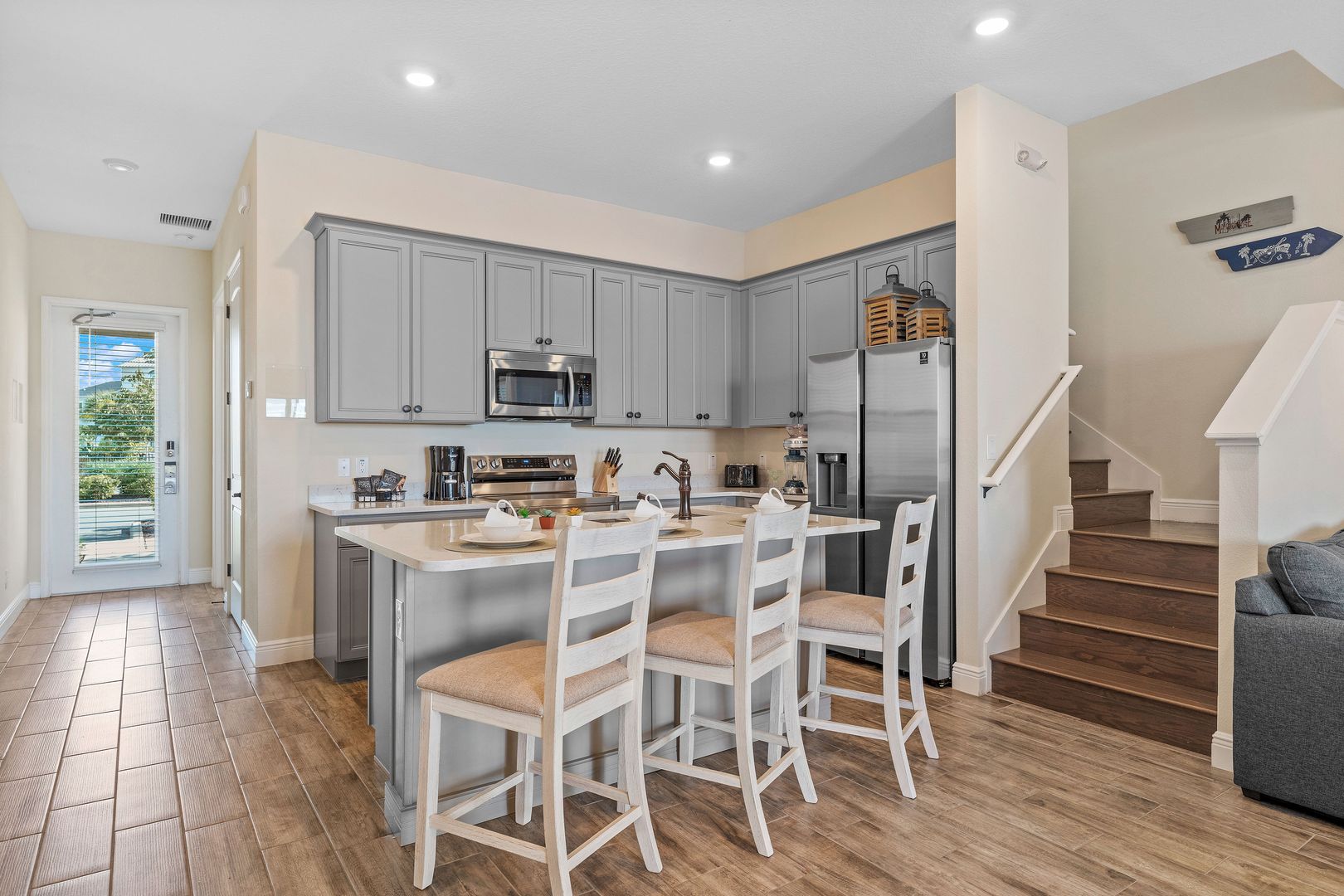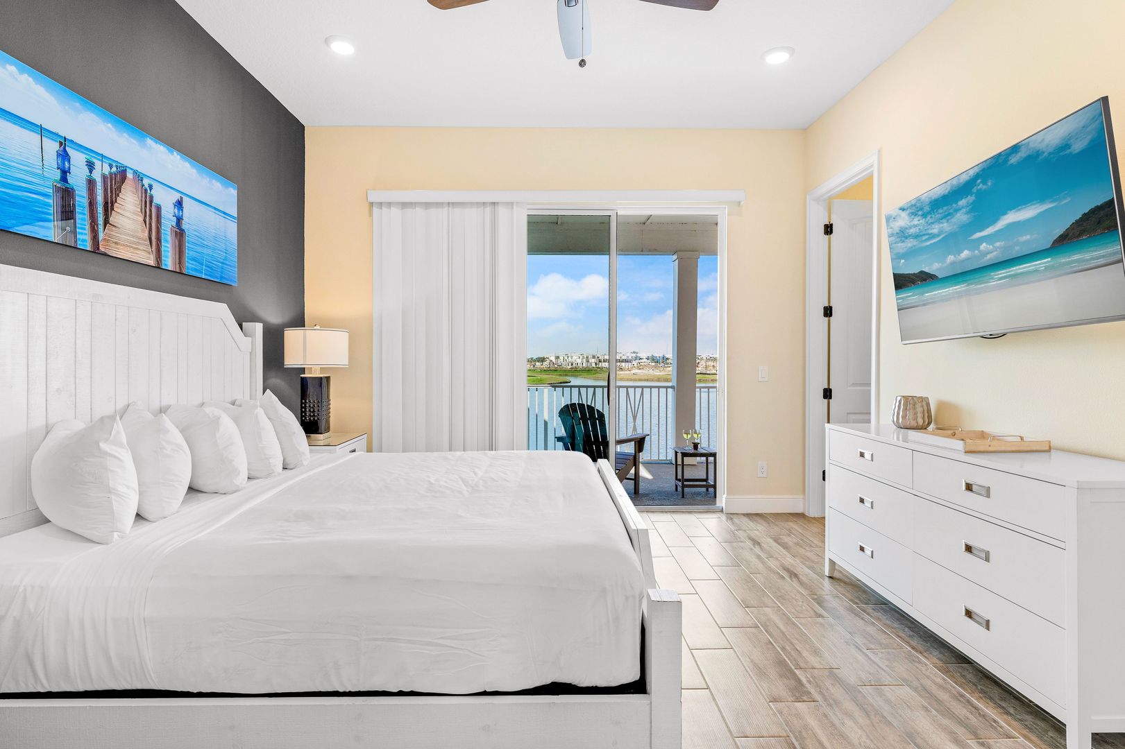 The highlight of this home is its prime waterfront location, with direct beach access from the back patio and beautiful water views from both levels. Enjoy two spacious balconies, one on each floor, perfect for relaxing and taking in the resort atmosphere.