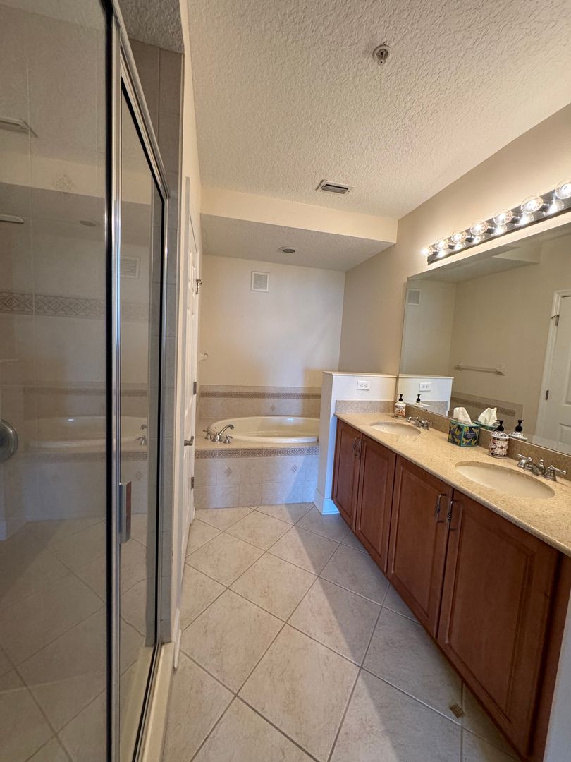 Gated in the heart of Dr. Phillips a beautiful Italian inspired condo in Toscana. Spacious condo has spectacular lake view from combined living/dining area and balcony. The kitchen is equipped with granite counters, 42" cabinets with lighting, stainless appliances, trash compactor, and an eat in area. Master suite has over-sized walk in closet, walk in shower with built in seat, dual vanities and garden tub. Second bedroom has private balcony. Tile throughout and carpet in bedrooms. Garage opens to interior hallway to elevator for direct access to private hallway for your unit! Community fitness, clubhouse, and pool. Water is included. HALF OFF DECEMBER RENT!